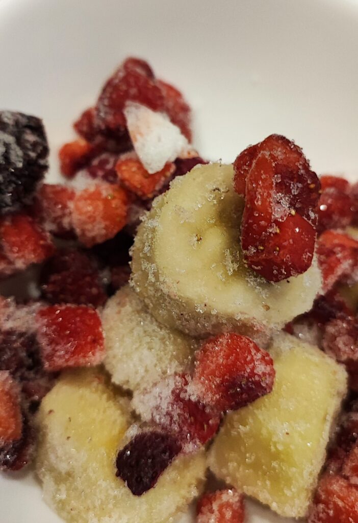 今回は、初めてなので、そのまま食べてみます!食べてみると、しっかりとした酸味がありながらおいしいベリーに、甘くておいしいバナナ!とっても美味しく頂けました!ヨーグルトのトッピングやスムージーにしてもよさそうですね!