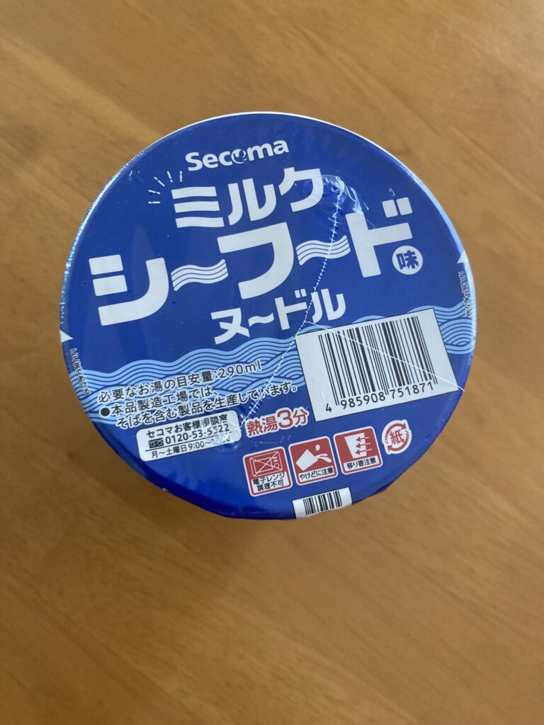 先日、近所のセイコーマートに行ったら、陳列棚に「ミルクシーフードヌードル」という商品があり、物珍しさに購入してみました。値段も税別118円と安く、主婦のお昼ご飯に良さそうです。